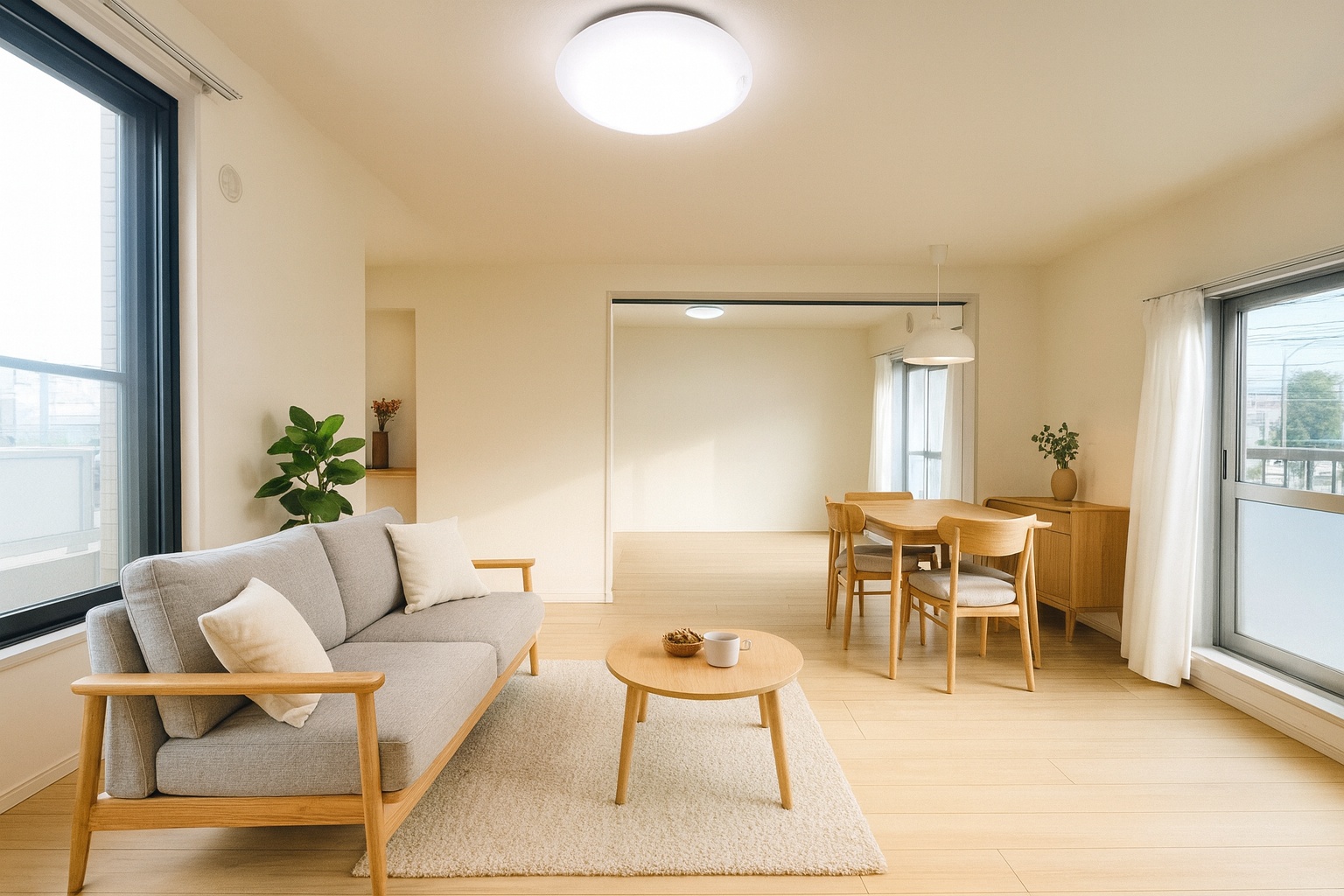 リビングは南西向きで日当たり良好。バルコニーに面した開放的な空間で、ゆったりと家族団らんの時間を過ごせます。キッチンからはリビング全体が見渡せ、子育て中のご家庭にも安心です。