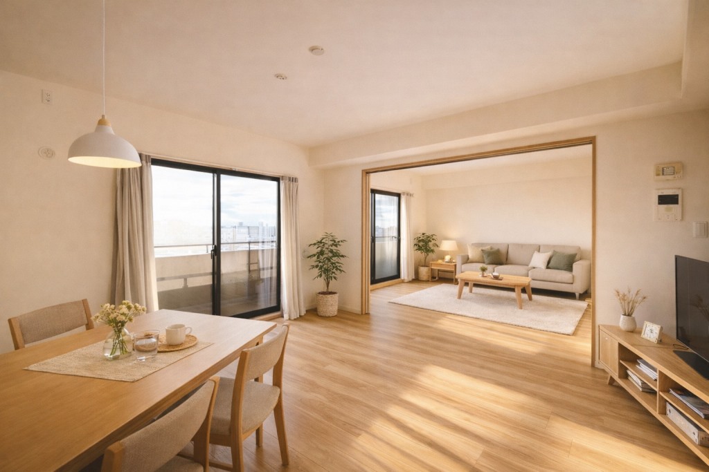 リビングは南西向きで日当たり良好。バルコニーに面した開放的な空間で、ゆったりと家族団らんの時間を過ごせます。キッチンからはリビング全体が見渡せ、子育て中のご家庭にも安心です。